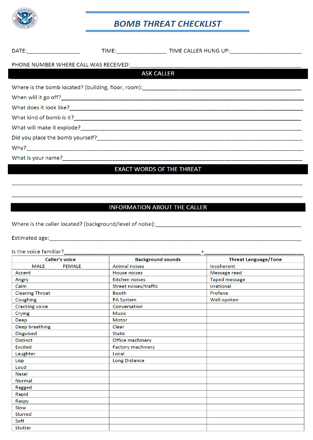 Write down the exact wording of the threat. Use the Bomb Threat Checklist to gather as much information as possible.