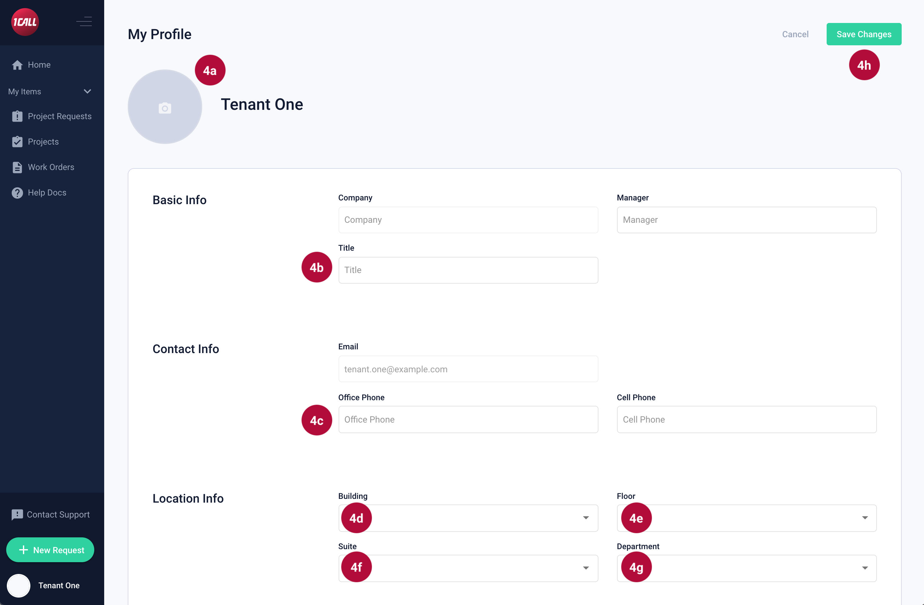4a. Update photo (optional) 4b. Enter a Job Title 4c. Enter your Office Phone number 4d. Select the Building in which you are located. 4e. Select the Floor in which you are located. 4f. Select the Suite in which you are located. 4g. Select the Department in which you are located. 4h. Select the Save Changes button |