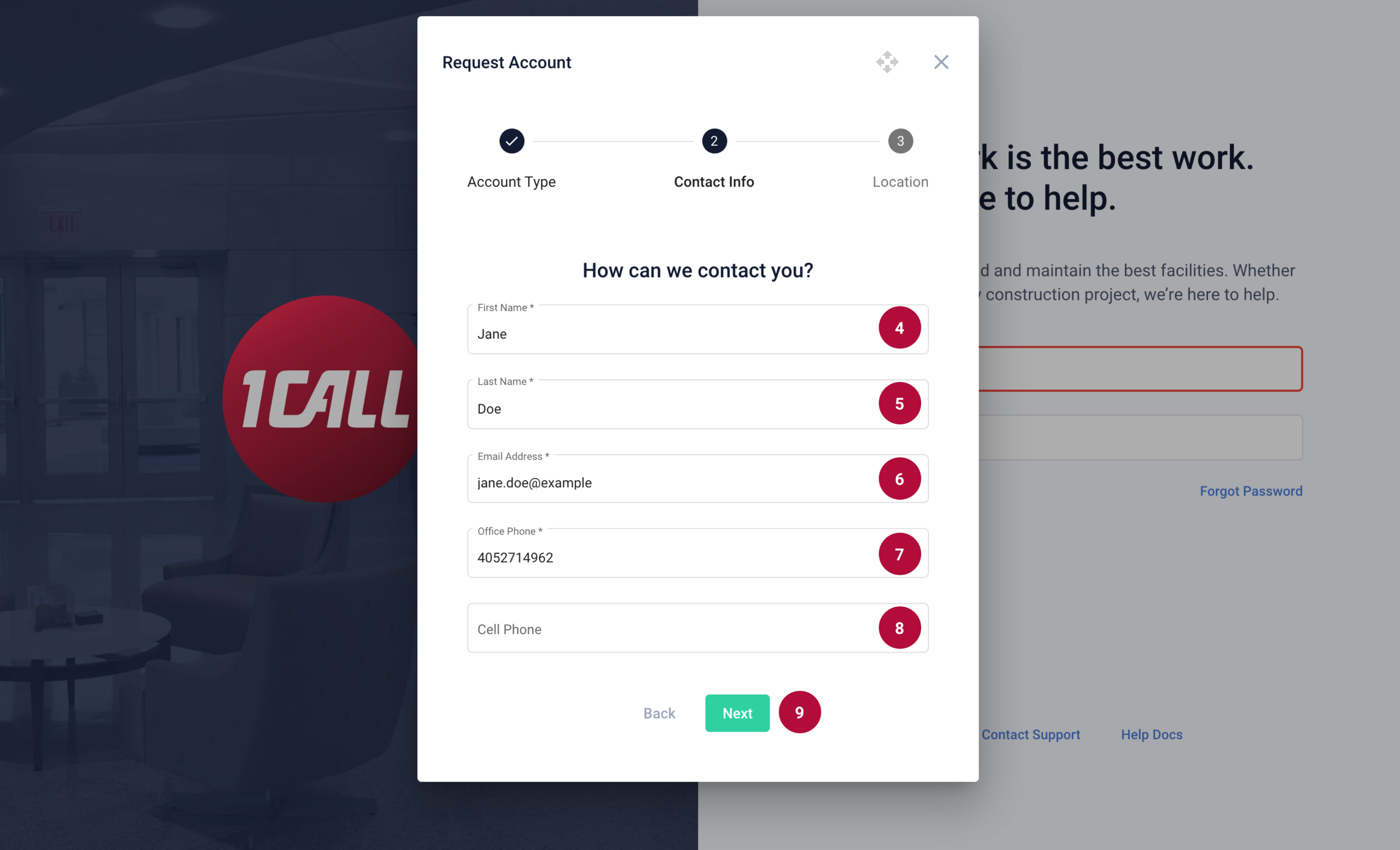 4. Enter your First Name 5. Enter your Last Name 6. Enter your Email Address 7. Enter an Office Phone Number 8. Enter a Cell Phone (Optional) 9. Select the Next button |