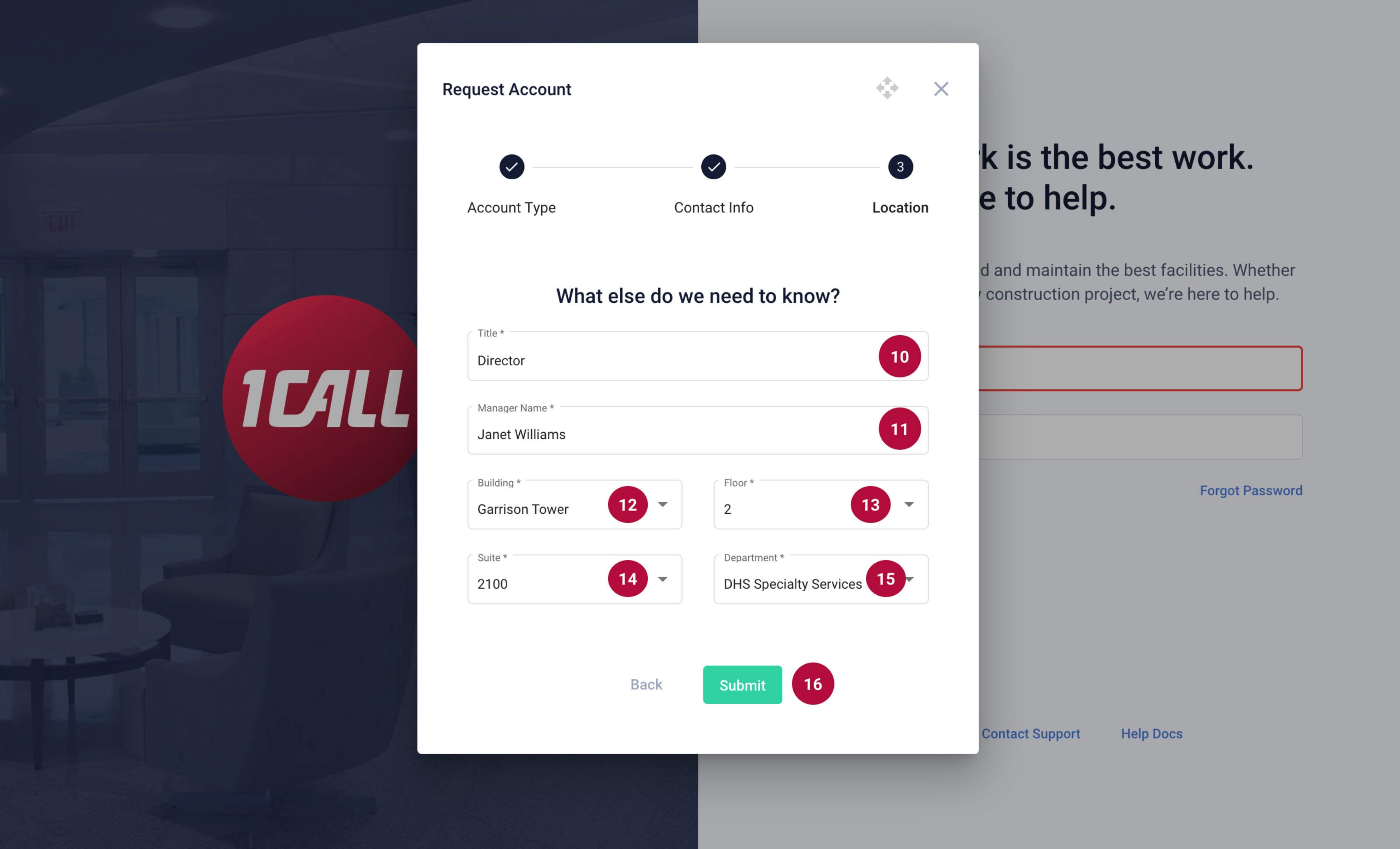 10. Enter your Job Title 11. Enter your Manager's Name Location Information If you are not a tenant in our facilities, select “Non-Trust Facility” under the building dropdown in step 12. Then fill in the rest of the information. 12. Select the Building 13. Select the Floor 14. Select the Suite 15. Select the Department 16. Select Submit |