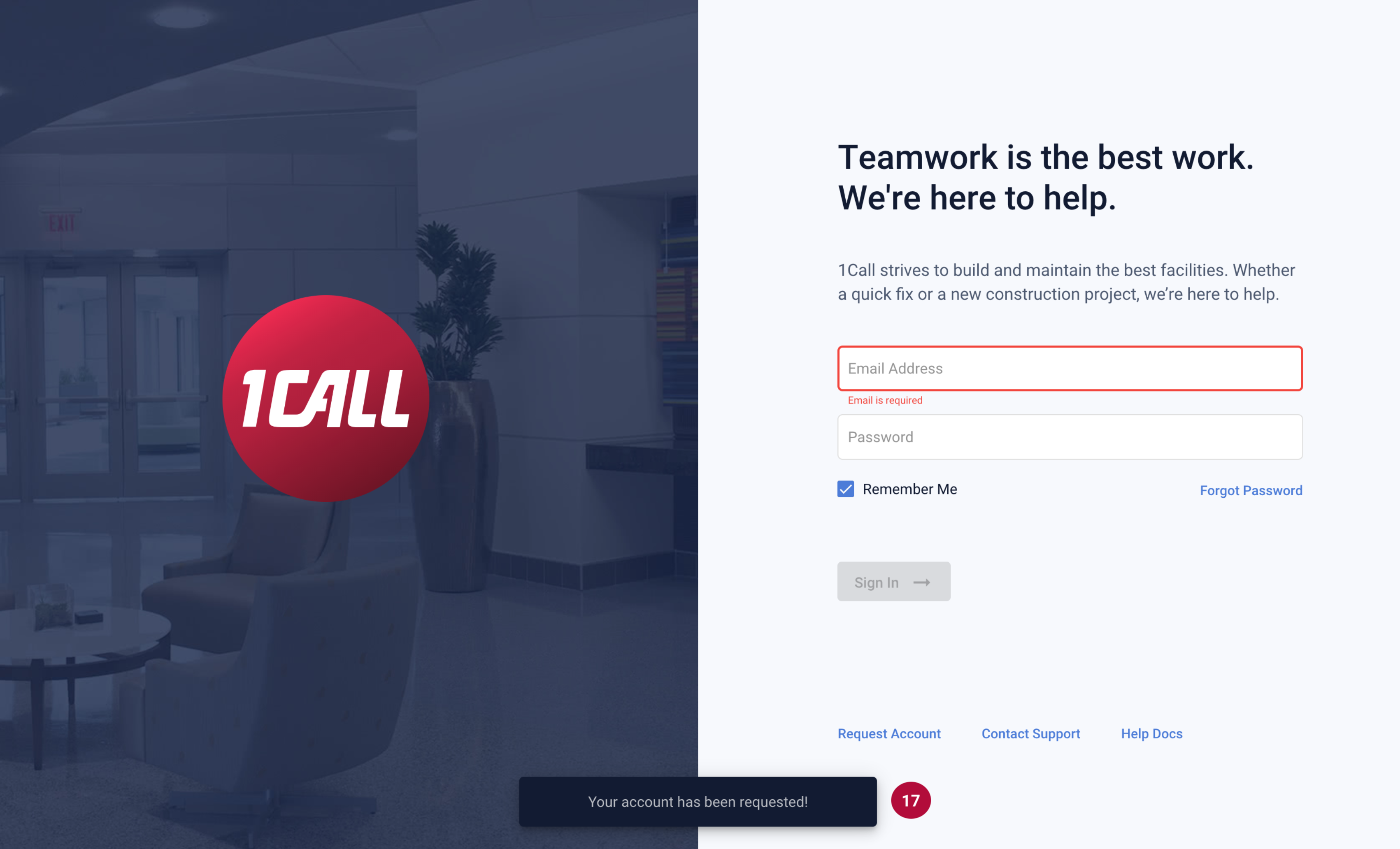 17. Your account request will be submitted into our system. A request will be sent to a 1CALL Cloud admin will review your information and determine your level of access. If approved, you will receive a follow-up email to login and finish setting up your account. |