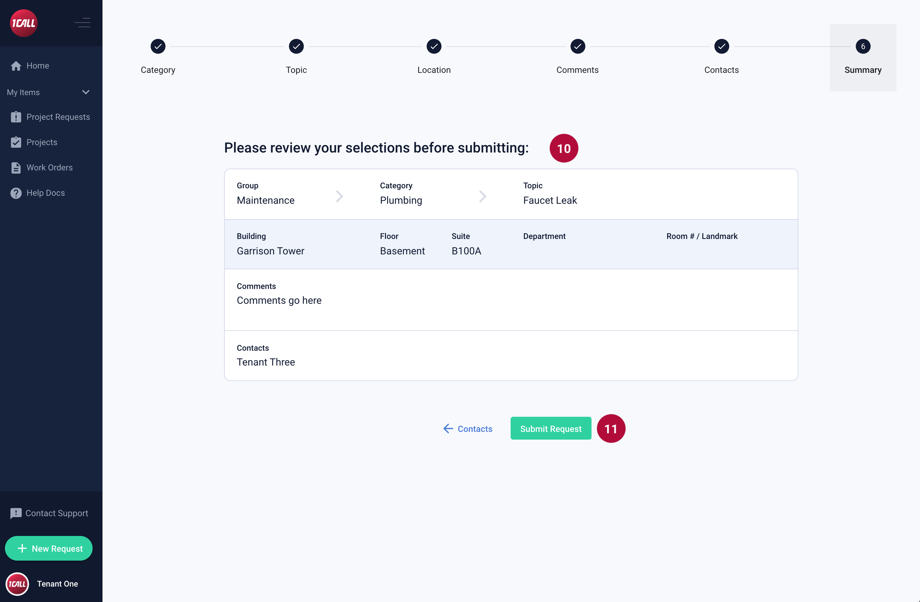 10. Review the Request Summary page to ensure your selections are accurate. 11. Select the Submit Request button |