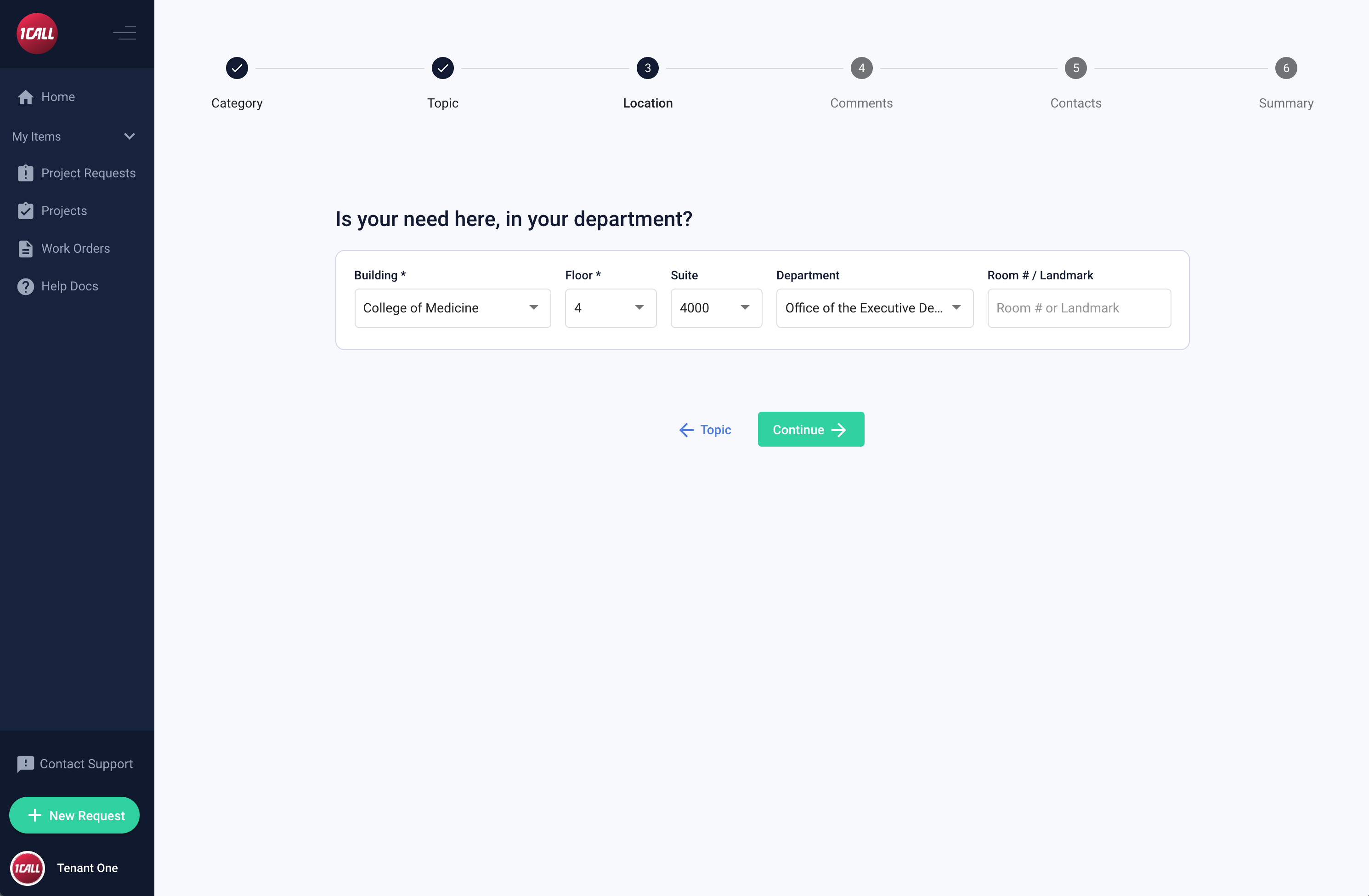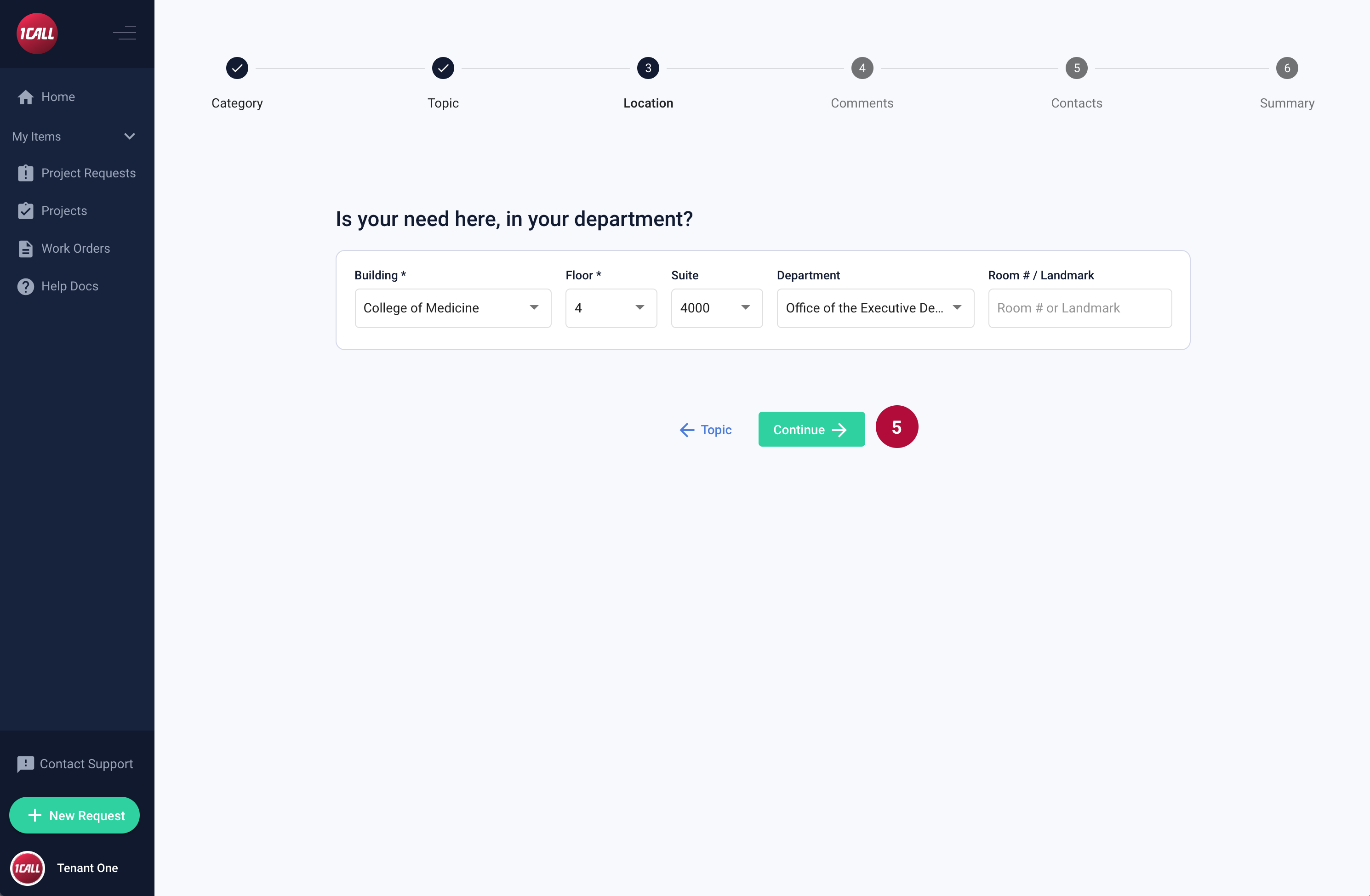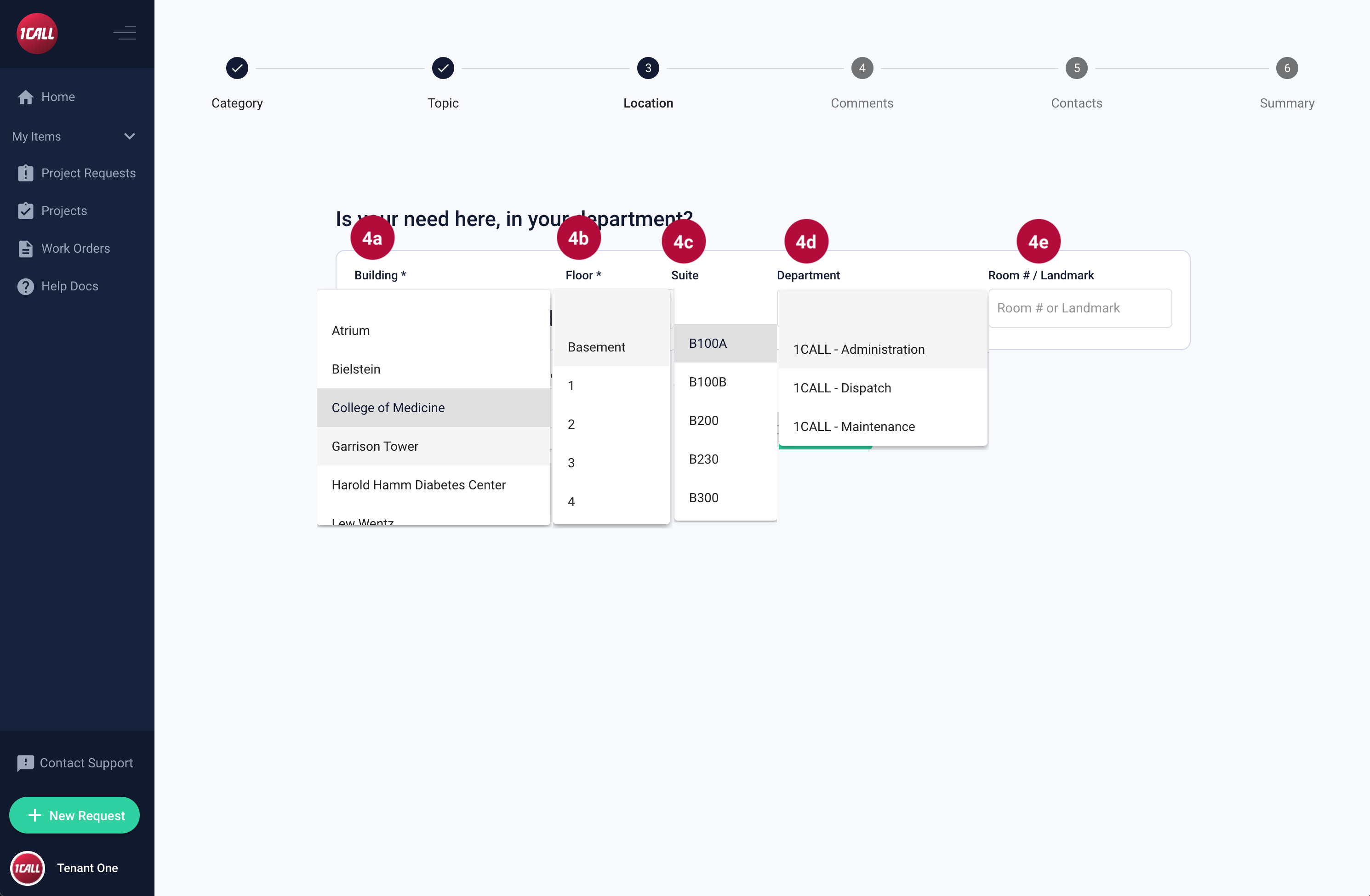 4a. Building (this field is required): Select the dropdown under Building and find the building that your request is related 4b. Floor (this field is required): Select the dropdown and choose the floor that relates to your request 4c. Suite (optional, but helpful): Select the dropdown and choose the suite that relates to your request, if applicable 4d. Department (optional, but helpful): Select the dropdown and choose the department that relates to your request, if applicable 4e. Room # / Landmark (optional, but helpful): Enter a Room # or Landmark