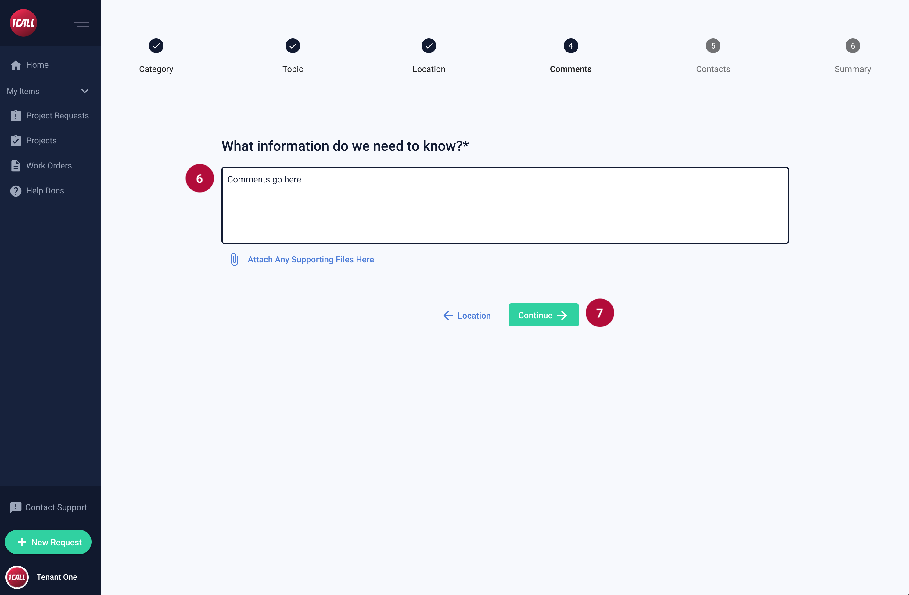 The location section displays and by default the location is auto selected according to the location you input on your user profile page. If these fields are blank, then you have not filled out the location information on your user profile. Click this link to see how to edit your profile and add your location information. If the location of the request is the same place as your user profile location, continue to Step 5. If the location of the request is different than your user profile location, you can change the fields in Step 4. |