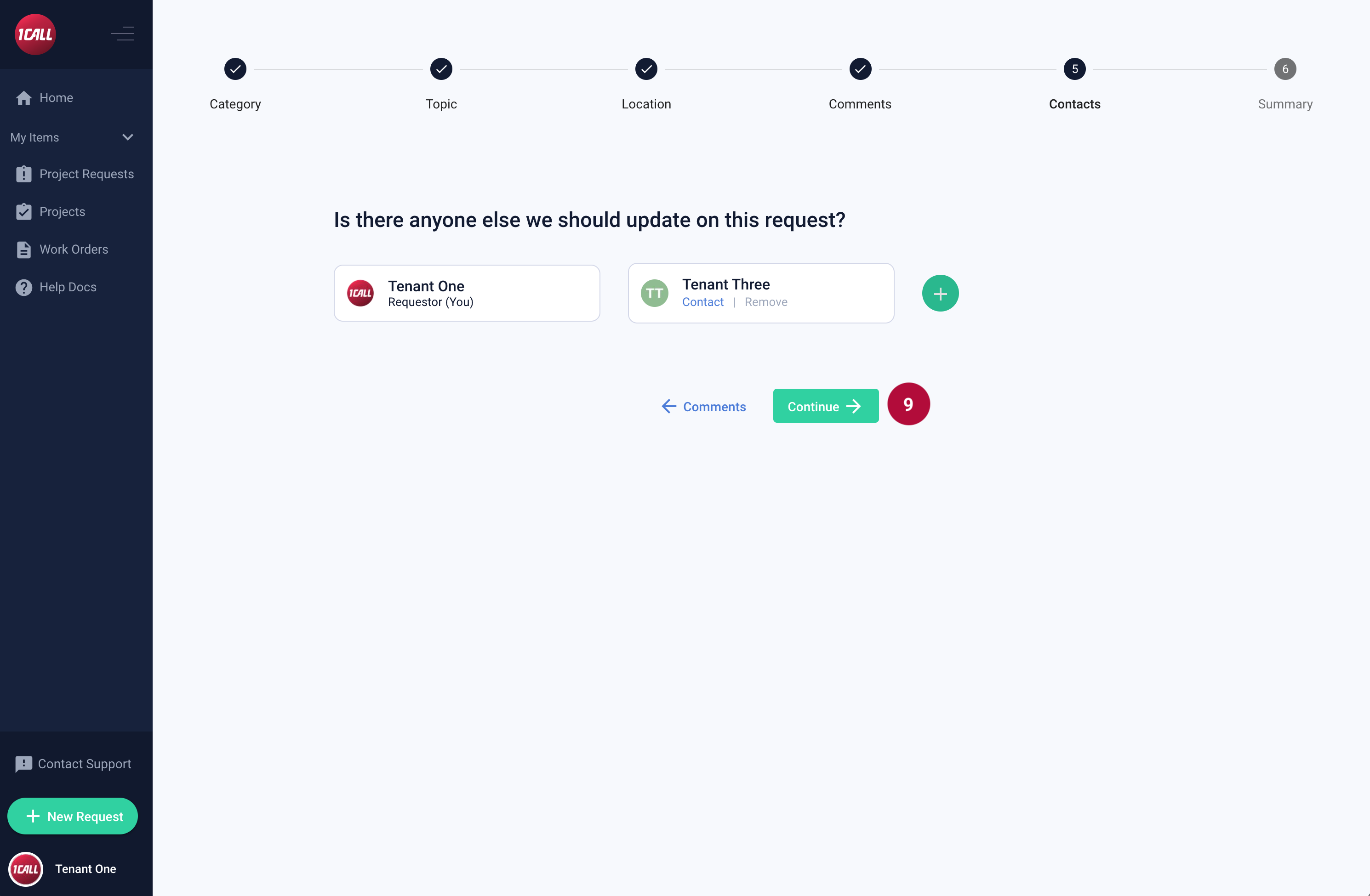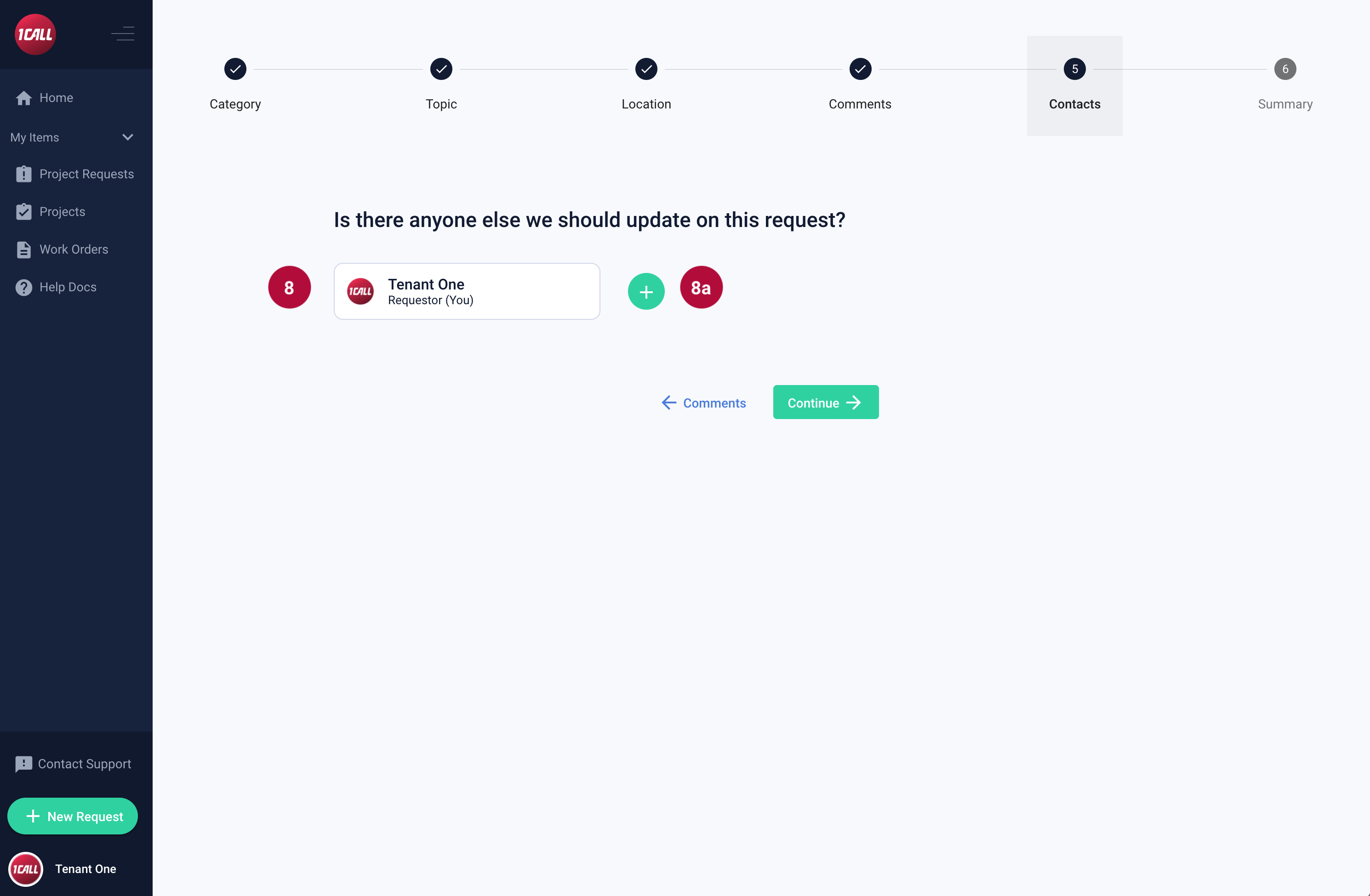 8. A contact or follower can be added to the request. This is optional. By default, you as the requestor are added as a follower onto the request by default. If you would like to add another follower to the request continue to 8a. Otherwise, continue to Step 9. 8a. Select the green + icon to add another follower. |