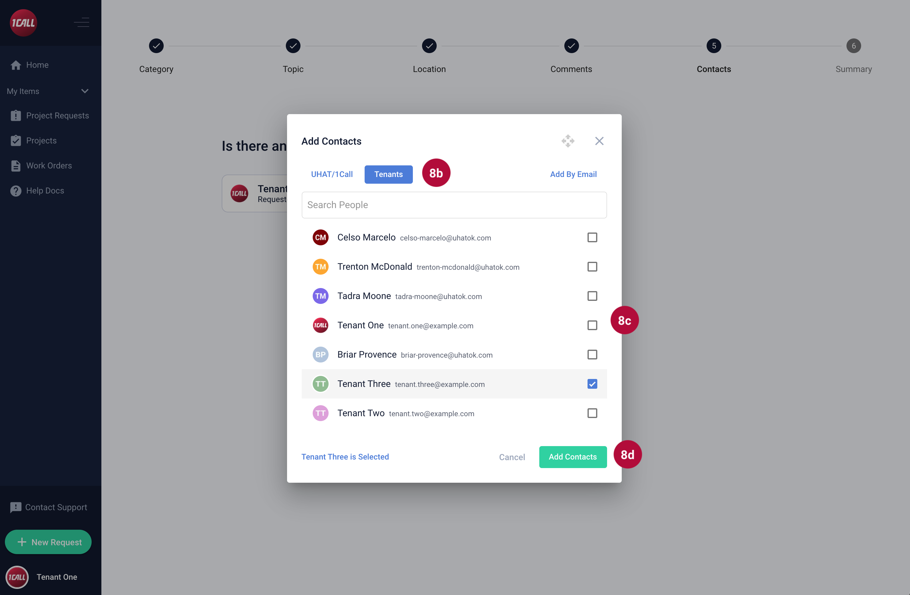 8b. Select Tenants Filter and type a name in the “Search People” filed. 8c. Select the checkbox to the right of the person you want to add. 8d. Select the Add Contacts button |